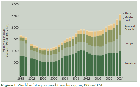 Het Stockholm International Peace Research Institute (SIPRI) constateert een ongekende stijging van de wereldwijde defensie-uitgaven in 2024 (tot een bedrag van 2.700 miljard dollar, met Europa en het Midden-Oosten op kop) en waarschuwt dat “naarmate regeringen steeds meer prioriteit geven aan militaire veiligheid, vaak ten koste van andere begrotingsposten, de economische en sociale afwegingen de komende jaren aanzienlijke gevolgen kunnen hebben voor de samenleving”. [9]