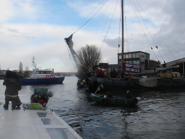 Zondag 18 december. Op dit moment spelen vier bands op een vloot van zeven boten die is afgemeerd voor de bajesboten in Zaandam. Het solidariteitsconcert is een muzikaal protest tegen het beleid dat mensen zonder papieren opsluit, buitensluit en uitzet. De mensen die zijn opgesloten op de bajesboten kunnen de bands goed horen en zien en reageren enthousiast op de steunbetuiging.
