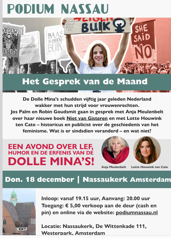 Vijftig jaar geleden maakten de Dolle Mina’s naam met hun ludieke acties voor vrouwenrechten. Hoe actueel is hun strijd vandaag nog? Wat is de betekenis van De Schaamte voorbij, toen en nu? En wat kunnen we leren van hun lef, humor en vastberadenheid? Jos Palm en Robin Goudsmit in gesprek met Anja Meulenbelt en Lotte Houwink ten Cate.