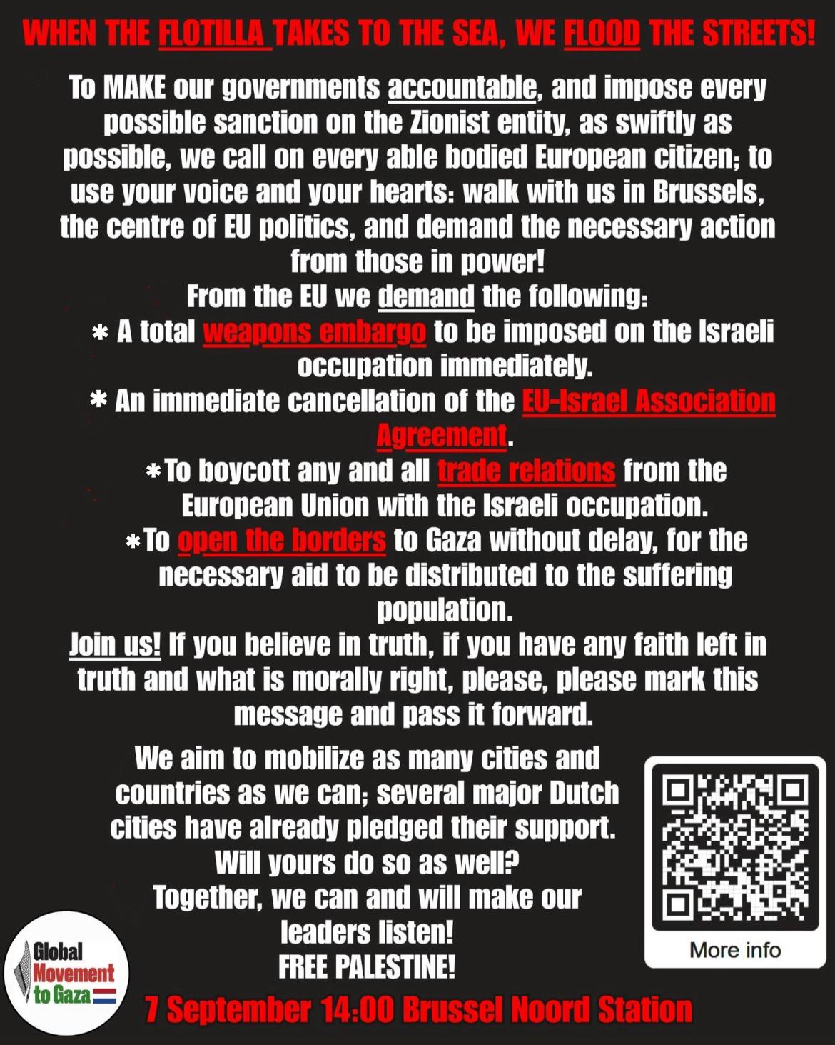 Zaterdag 7 sept. Brussel: Europese demonstratie voor Palestina. 14:00 Noordstation…